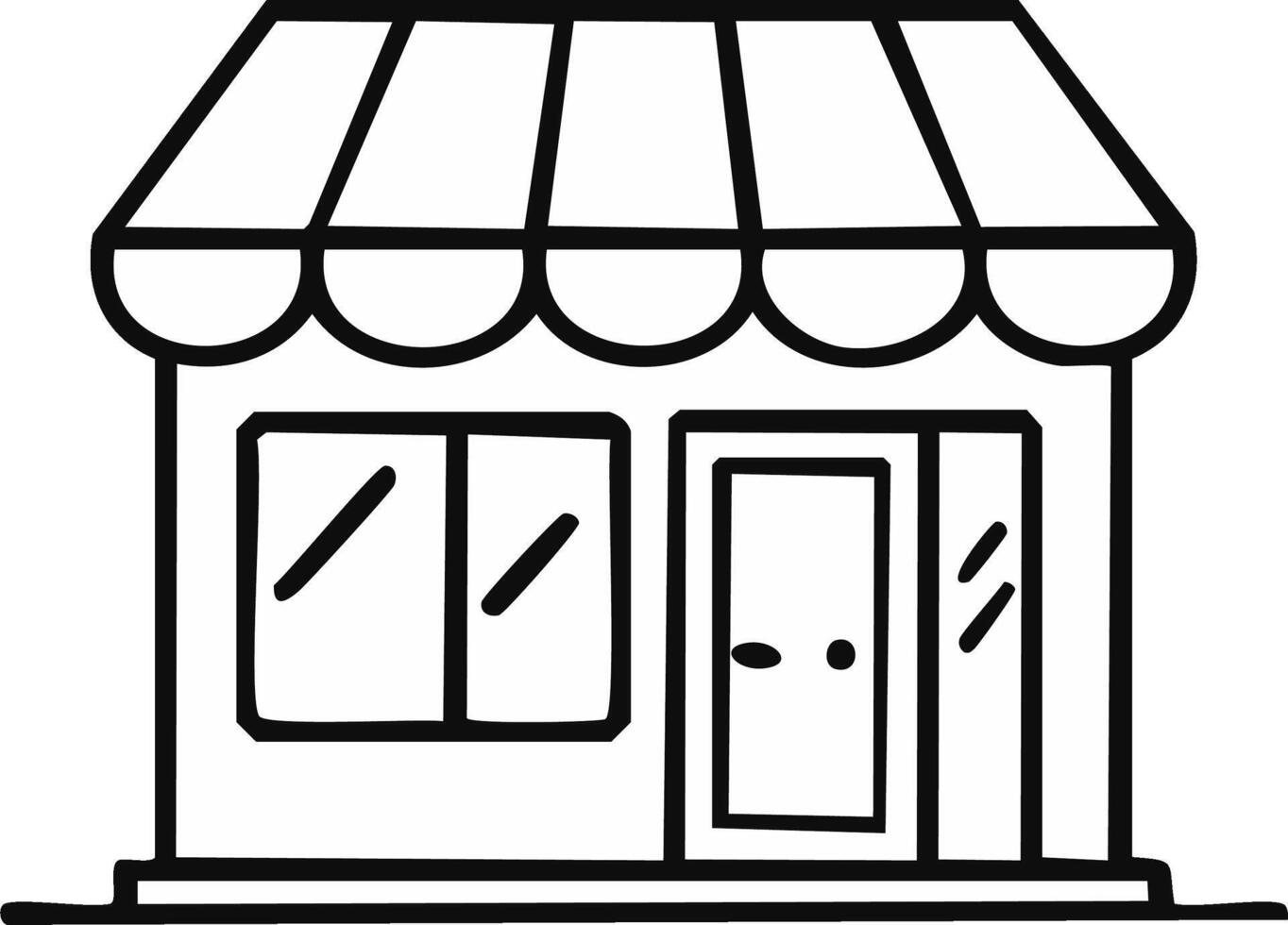 Simple line drawing of a storefront with awning, display window, and double doors Pro Vector