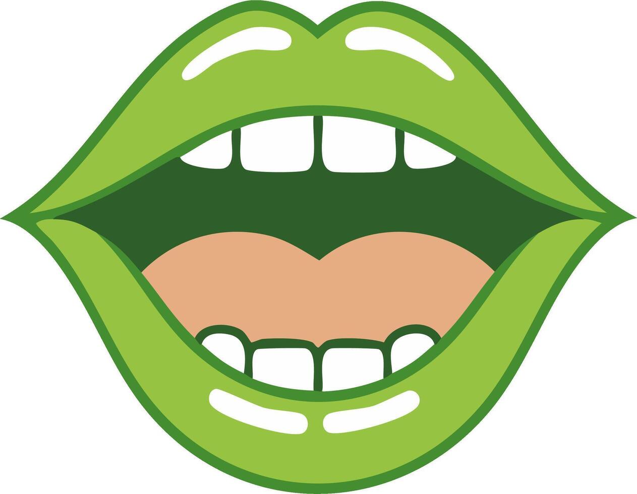 Illustration of Open Green Lips with Teeth and Tongue, representing a mouth wide open as if singing, shouting, or speaking loudly Pro Vector