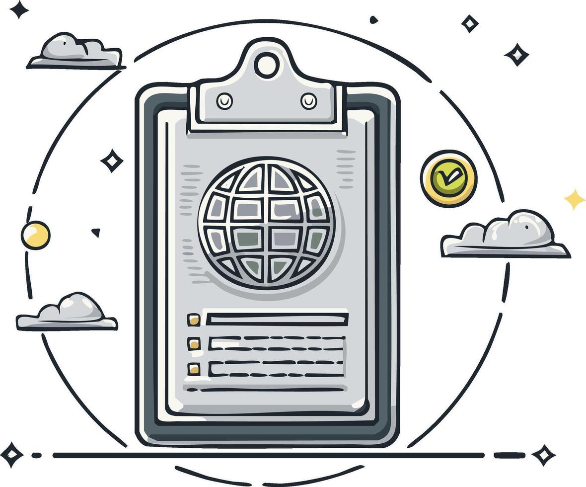 Global task list on clipboard with checklist items and clouds, representing international projects Pro Vector