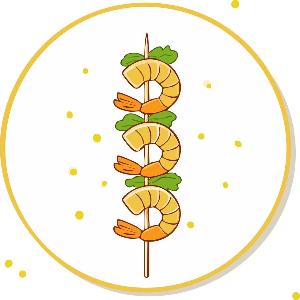Delicious shrimp skewers with lettuce in a minimalist style drawing and golden polka dot pattern Pro Vector