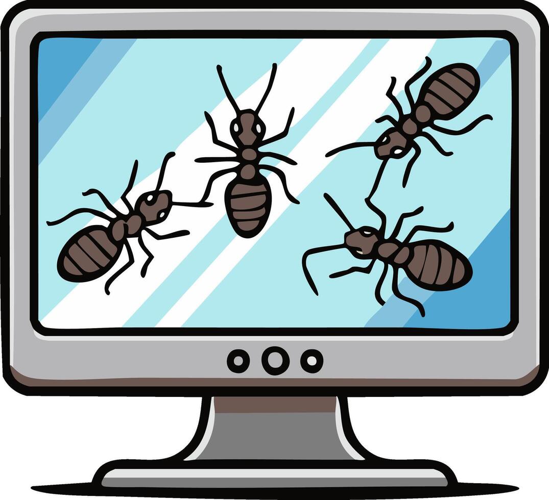 Cartoon ants on a computer monitor screen representing software bugs and viruses Pro Vector