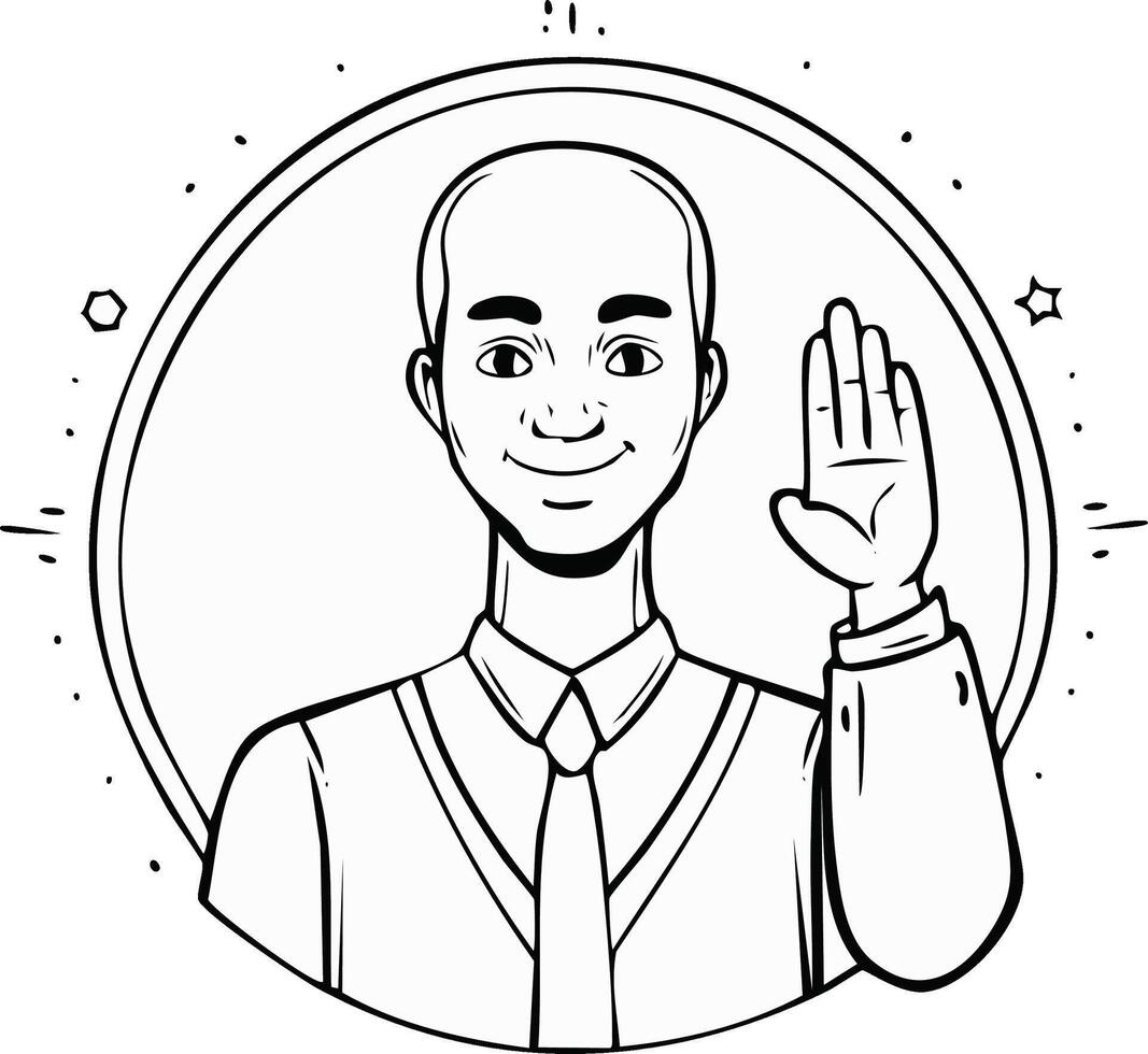 Man in suit raising hand in greeting or introduction inside a circular frame Pro Vector