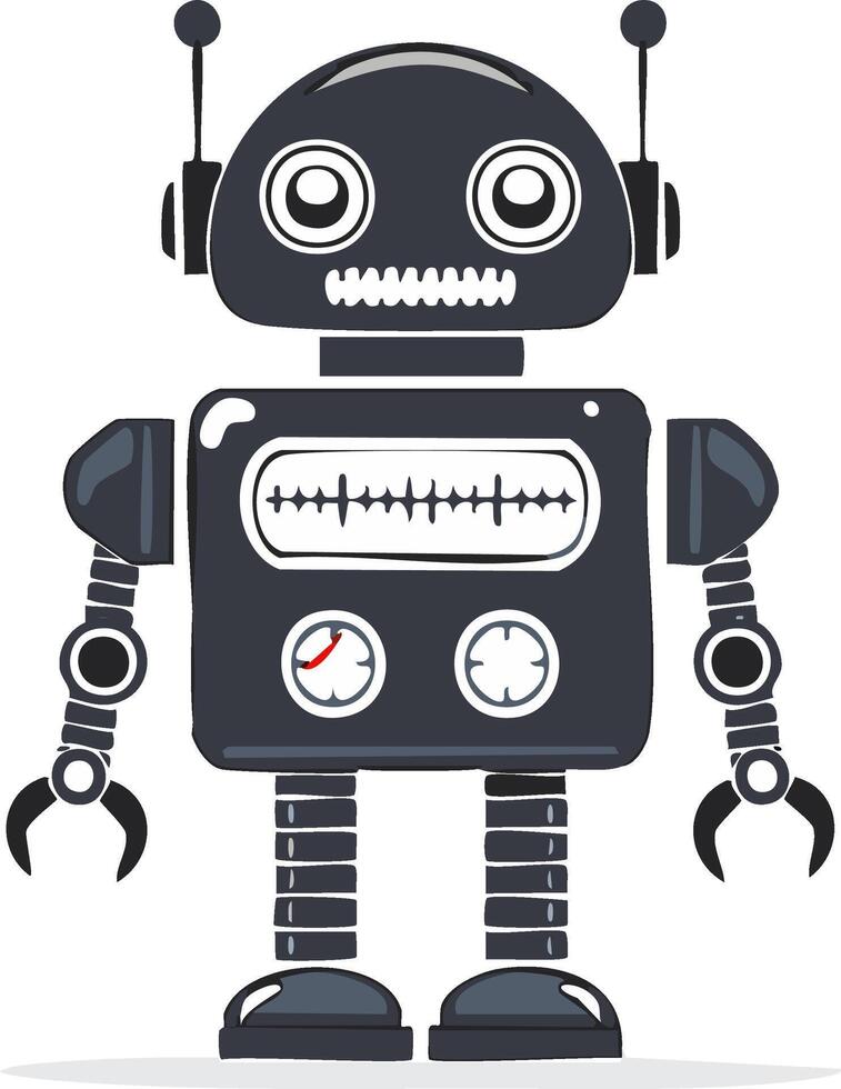 Friendly dark gray robot character with retro mechanical design and big expressive eyes Pro Vector