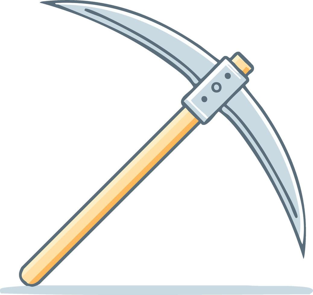 Cartoon illustration of a double bladed pickaxe tool for digging and mining with wooden handle and sharp metal blades Pro Vector