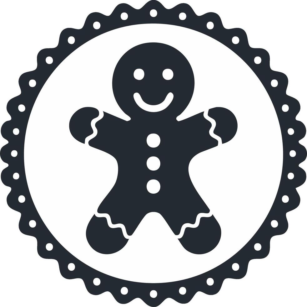 Simple gingerbread man cookie graphic with a smiling face in a classic scalloped circular frame Pro Vector
