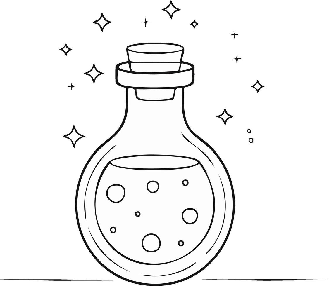 Magical Potion Bottle with Bubbles, Outline Style with Stars, Healing or Spell Elixir Pro Vector