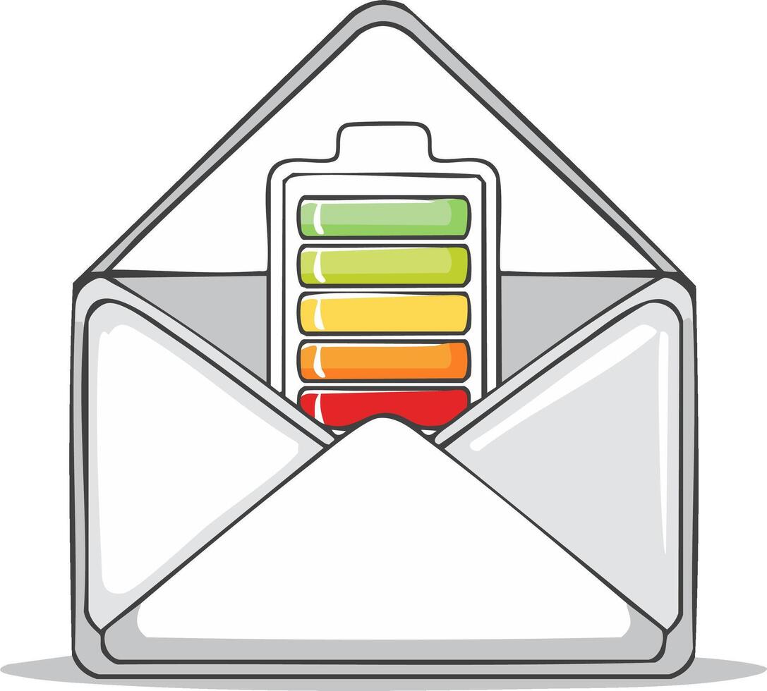 Email message concept with a full battery power indicator inside an open envelope Pro Vector