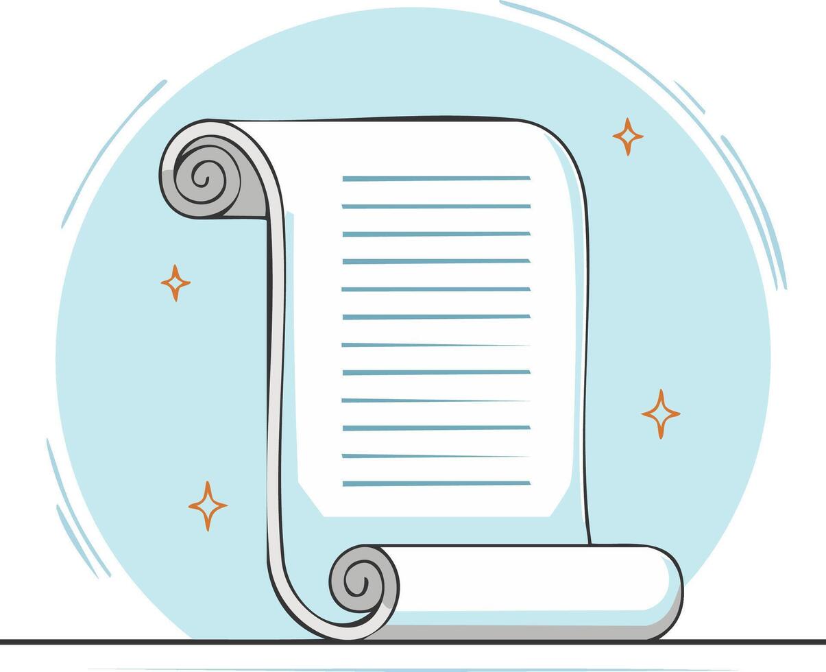 Illustration of a partially unrolled ancient scroll or parchment with text lines and magical sparkle effects Pro Vector