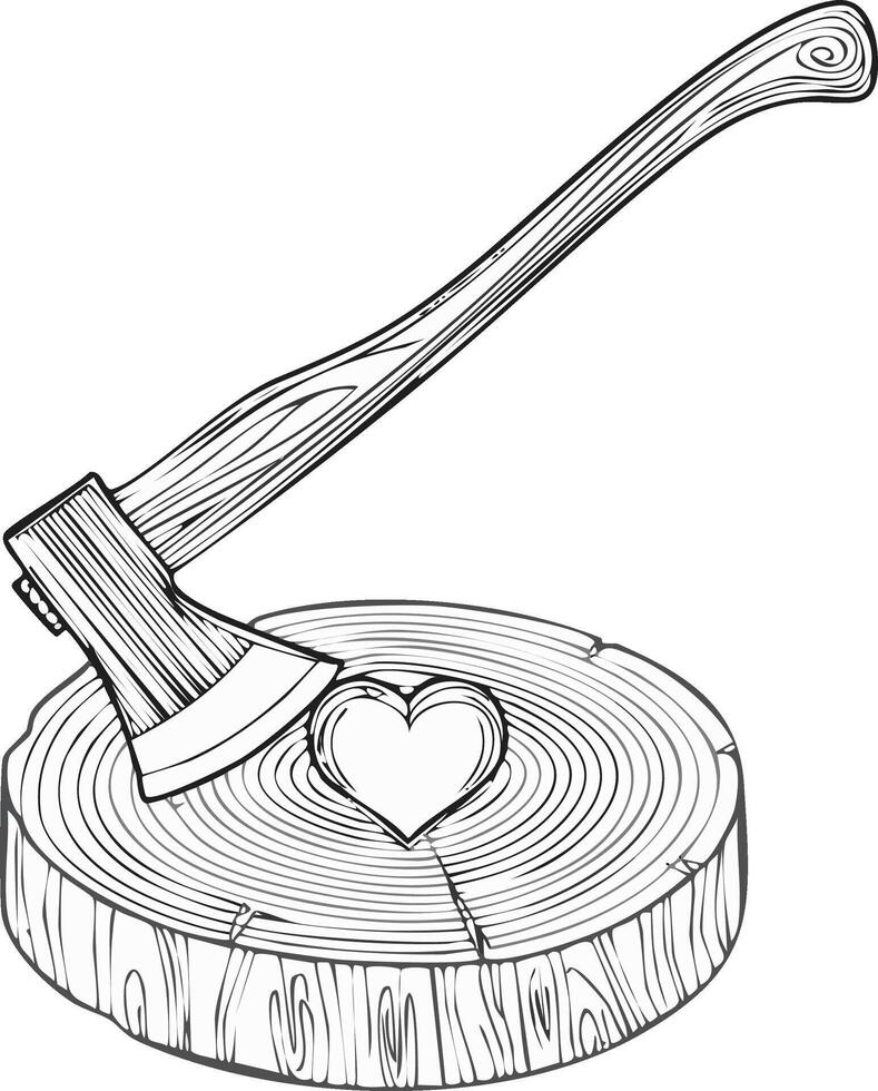 Conceptual line drawing of an axe stuck in a tree stump with a carved heart Pro Vector