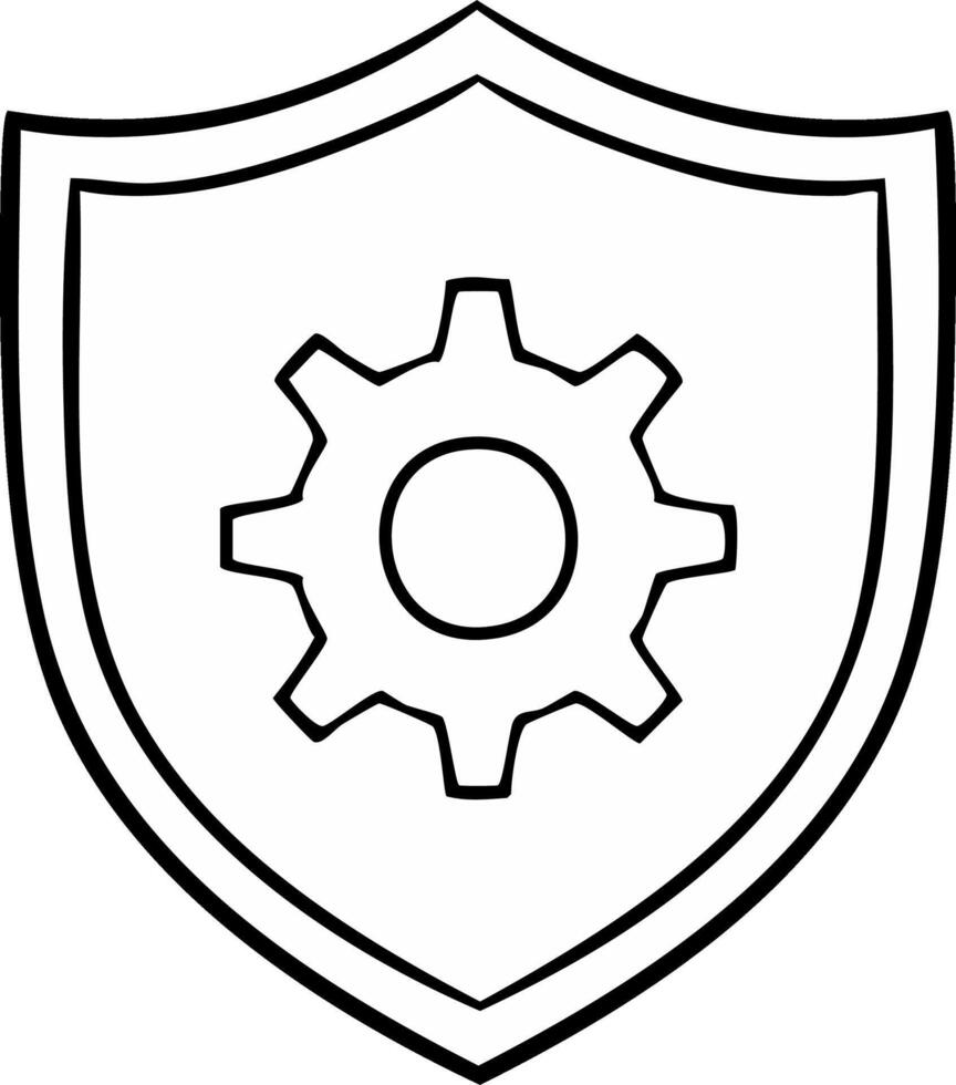 Black and white outline icon of a shield with a gear inside, symbolizing security, system settings, protection, and configuration Pro Vector