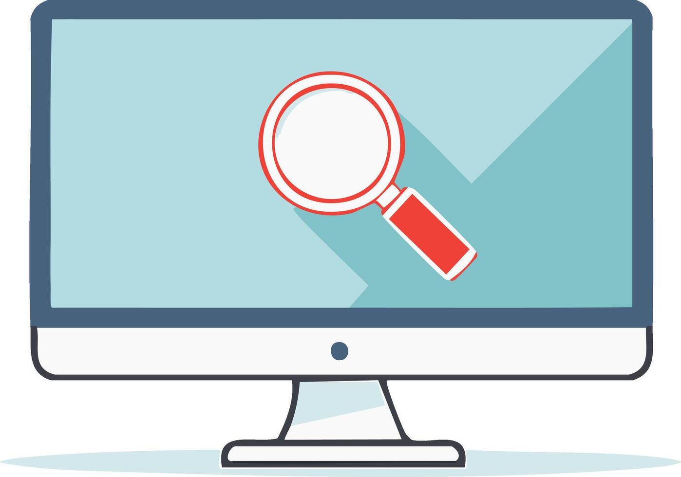 Desktop Computer Screen Displaying Magnifying Glass Icon for Searching, Data analysis, research and finding information Pro Vector