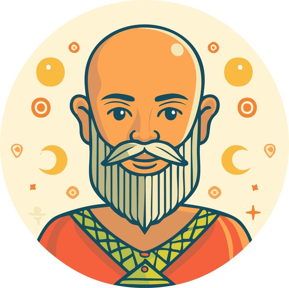 Stylized portrait of a bald man with a long beard and mustache in traditional attire with mystical elements Pro Vector