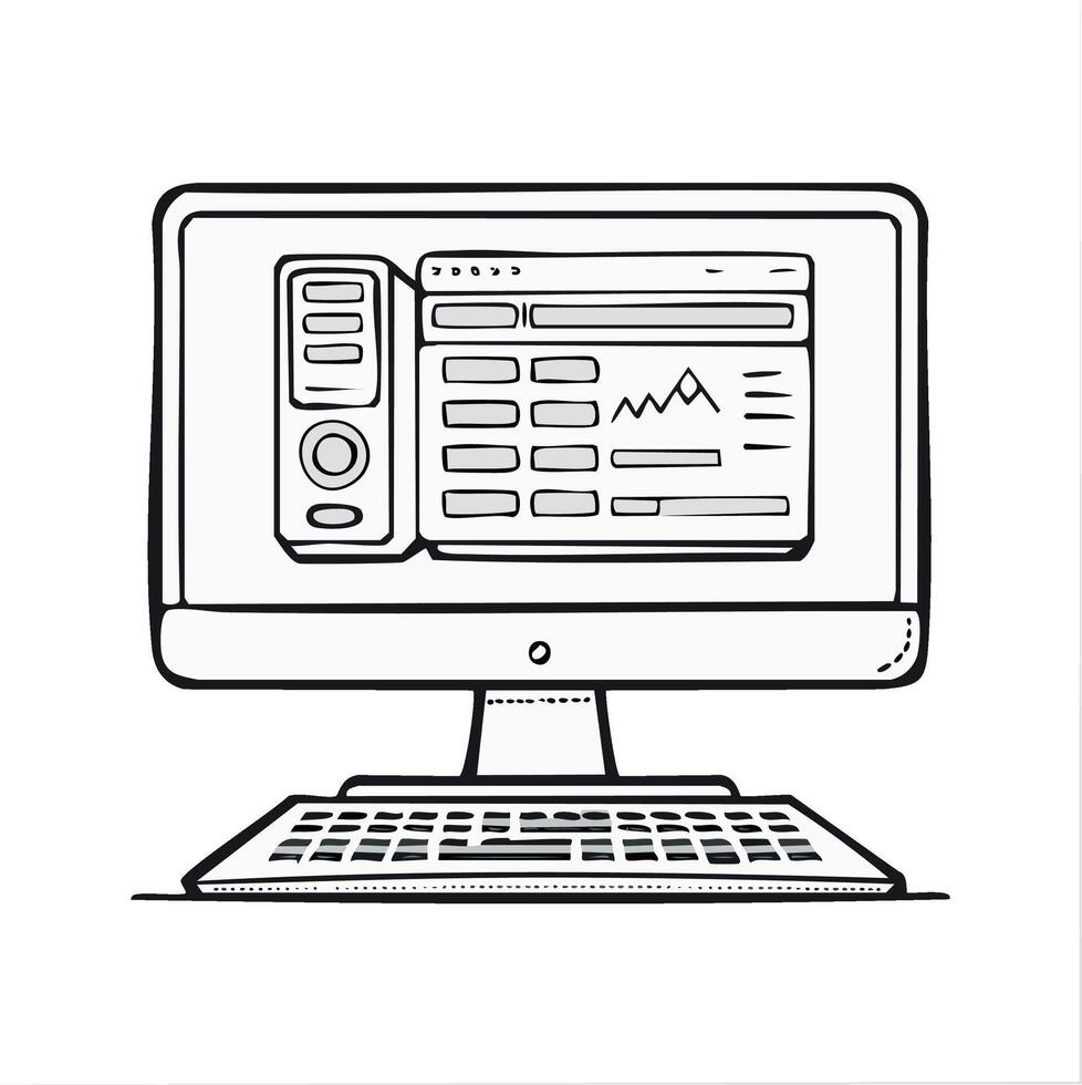 Illustration of a computer monitor with keyboard, screen displays charts and data Pro Vector