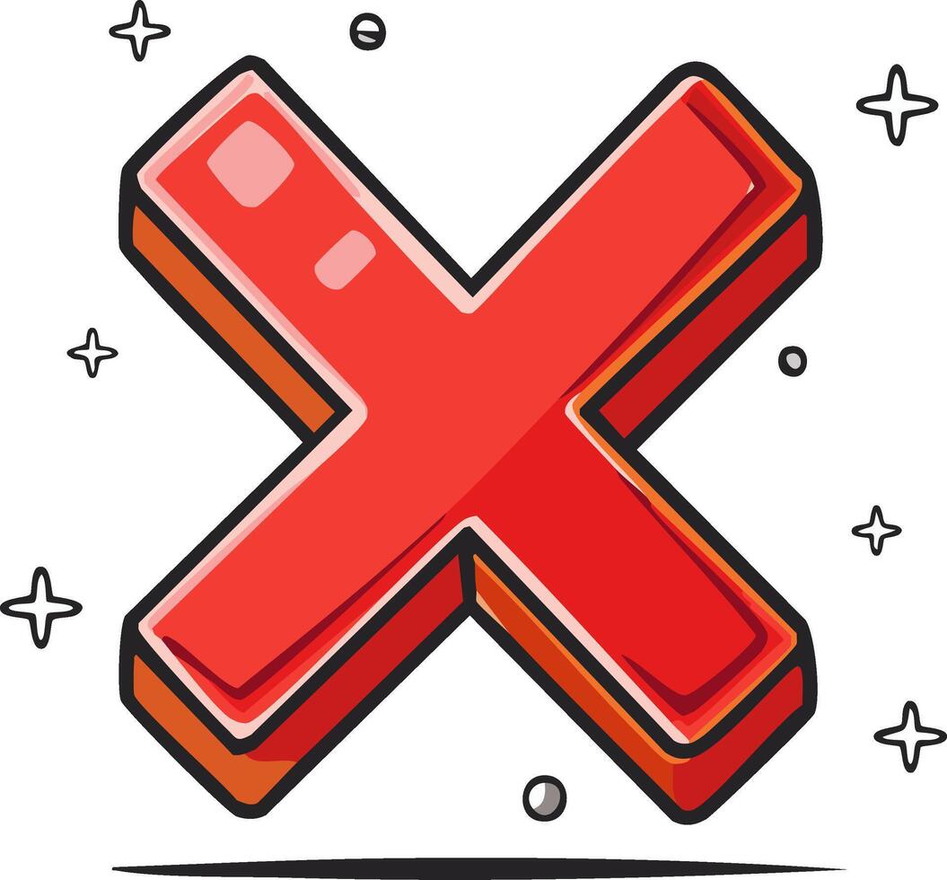 Red X mark icon. Cartoon design with stars and shadow. Symbol for error and negative Pro Vector