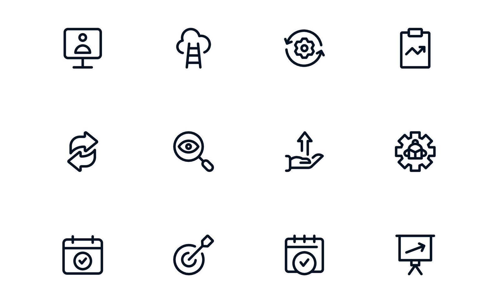 Productivity icon set illustrating goal setting, milestone tracking, and task completion for effective project and time management Pro Vector