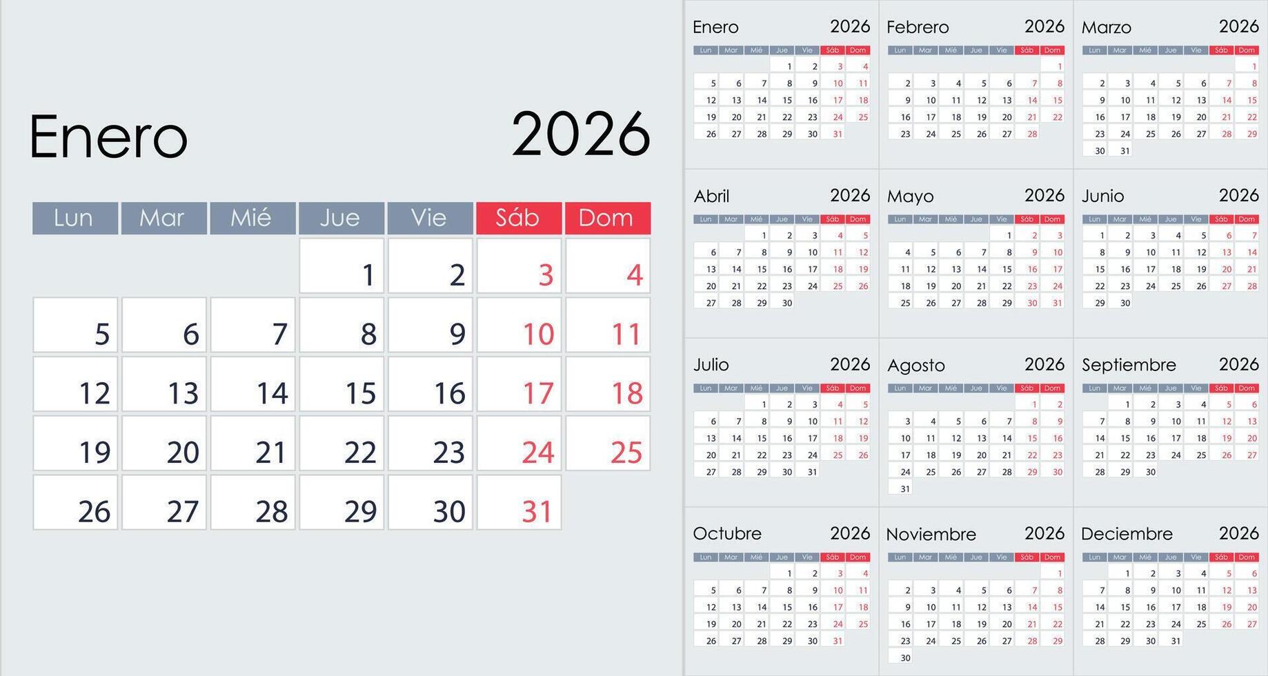 Clean Minimalist 2026 Yearly Calendar Grid Layout, on Spanish language Pro Vector