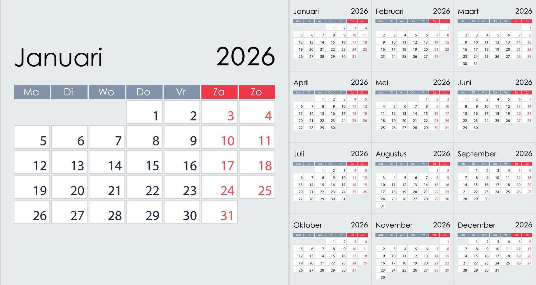 Clean Minimalist 2026 Yearly Calendar Grid Layout, on Dutch language Pro Vector