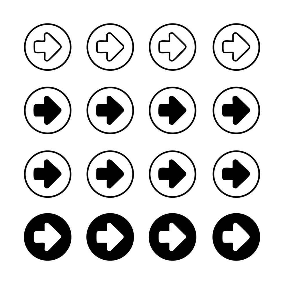 Set of 16 right-pointing arrow icons in a minimalist black and white silhouette style for user interface elements Pro Vector