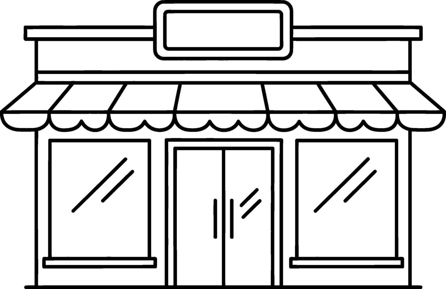 Monochrome illustration of a storefront building with a striped awning, large windows, and a blank sign above the entrance, suitable for various design applications vector