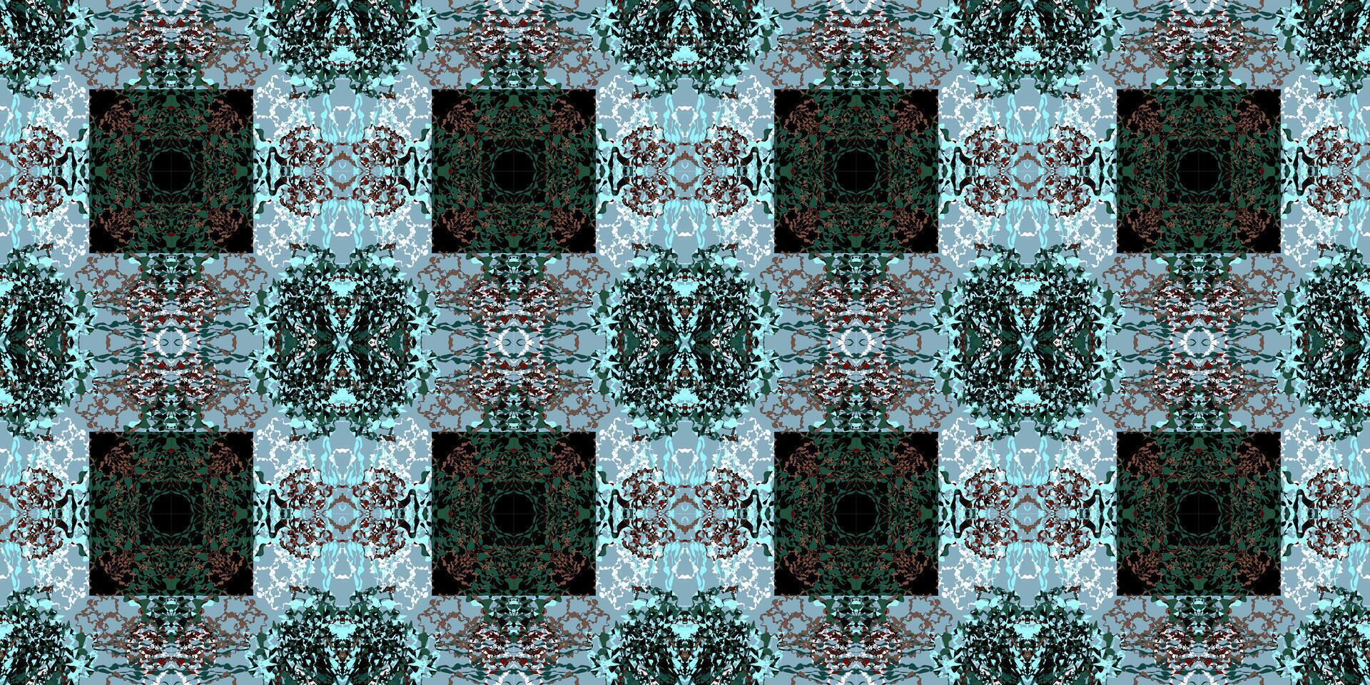 Abstract Kaleidoscopic Tiling Pattern in Muted Teal, Brown, and Black. Intricate Ornamental Mosaic Background with Dark Squares. Abstract Textile Design with Repetitive Grid Structure Pro Vector