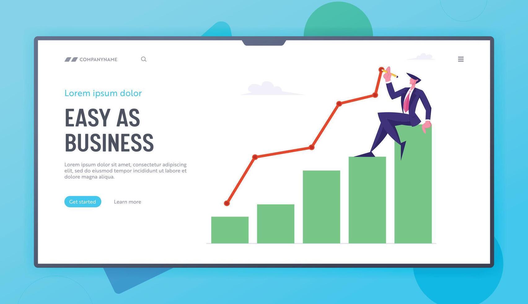 Business Man Sitting on Top of Growing Column Chart Drawing Curve Line. Businessman Work on Growth Data Analysis Arrow Graph Website Landing Page Set, Web Page. Cartoon Flat Illustration Banner Pro Vector