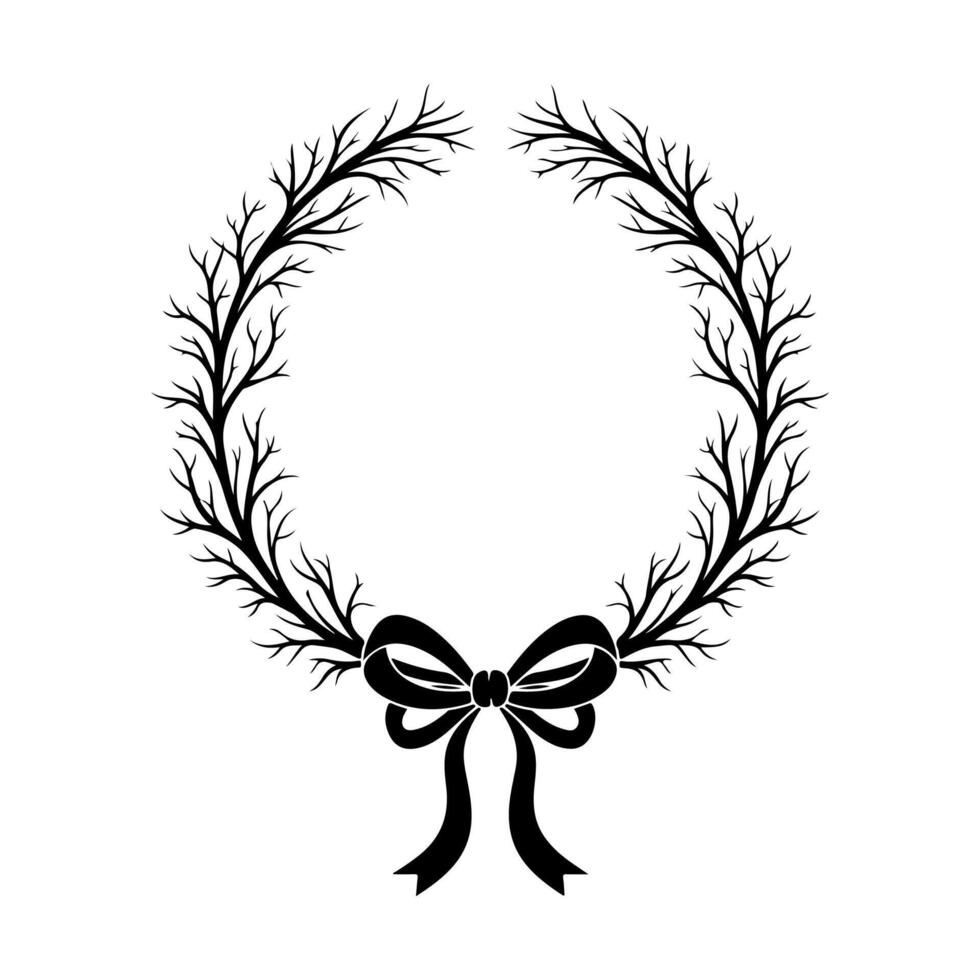 Black and white wreath design with branches, open in center, and a ribbon vector