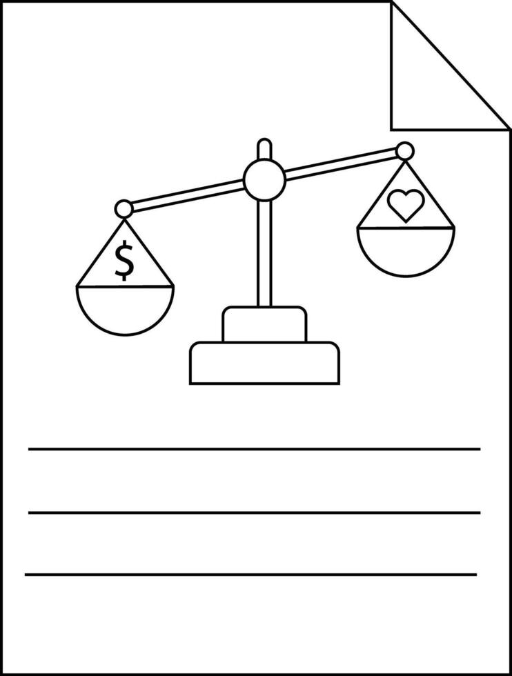 A line drawing of scales weighing money against a heart placed on a document with lines for writing Pro Vector