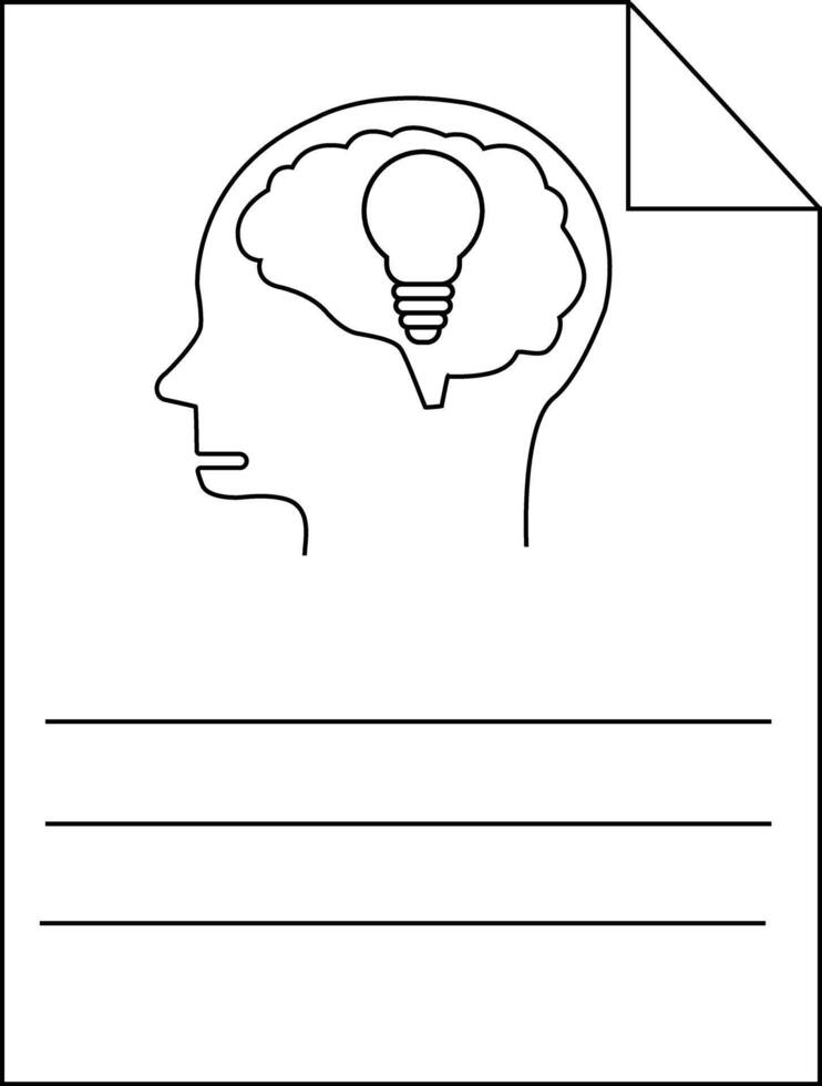 A white drawing on a page a head with a brain and a light bulb inside and three lines below Pro Vector