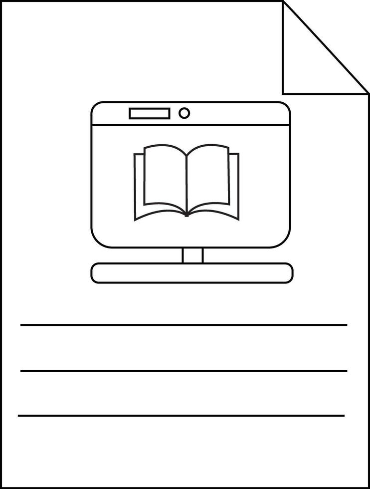 A document with a computer showing an open book and lines below a folded corner at the top Pro Vector