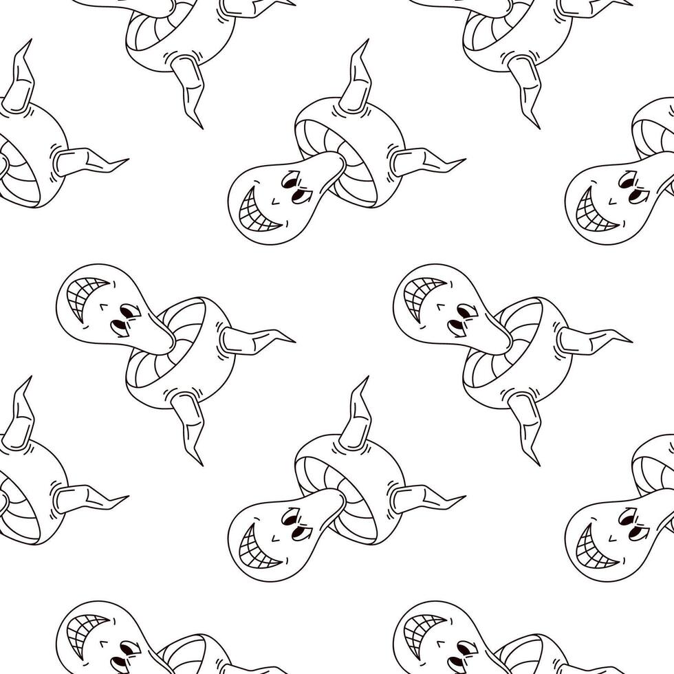Seamless pattern with groovy devil mushroom with smiling face and horns on white background in groovy line art style. vector