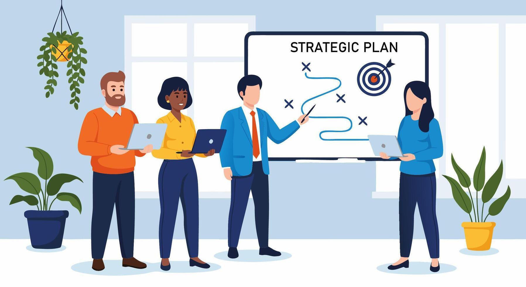 Diverse professional team collaborating on a strategic business plan, brainstorming innovative ideas and setting clear goals for future success and growth Pro Vector