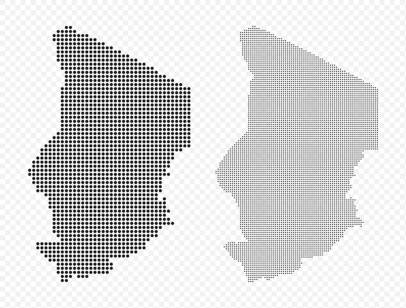 Black dotted pixel map of Chad and faded halftone version isolated on transparent background for design Pro Vector