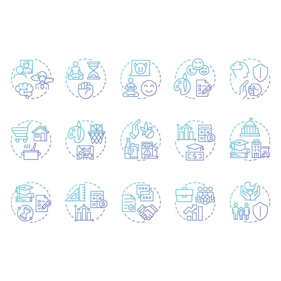 Core life skills blue gradient concept icons. Basic competencies to deal with daily tasks. Self management. Icon pack. Round shape illustrations for presentation. Abstract idea Pro Vector