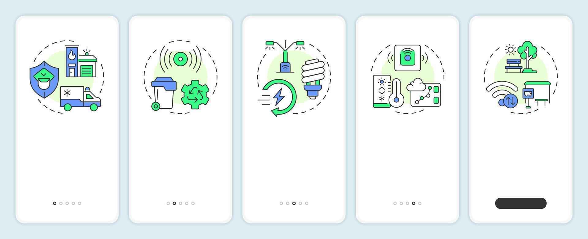 Smart city infrastructure and services onboarding mobile app screen. Walkthrough 5 steps editable graphic instructions with linear concepts. UI, UX, GUI Pro Vector