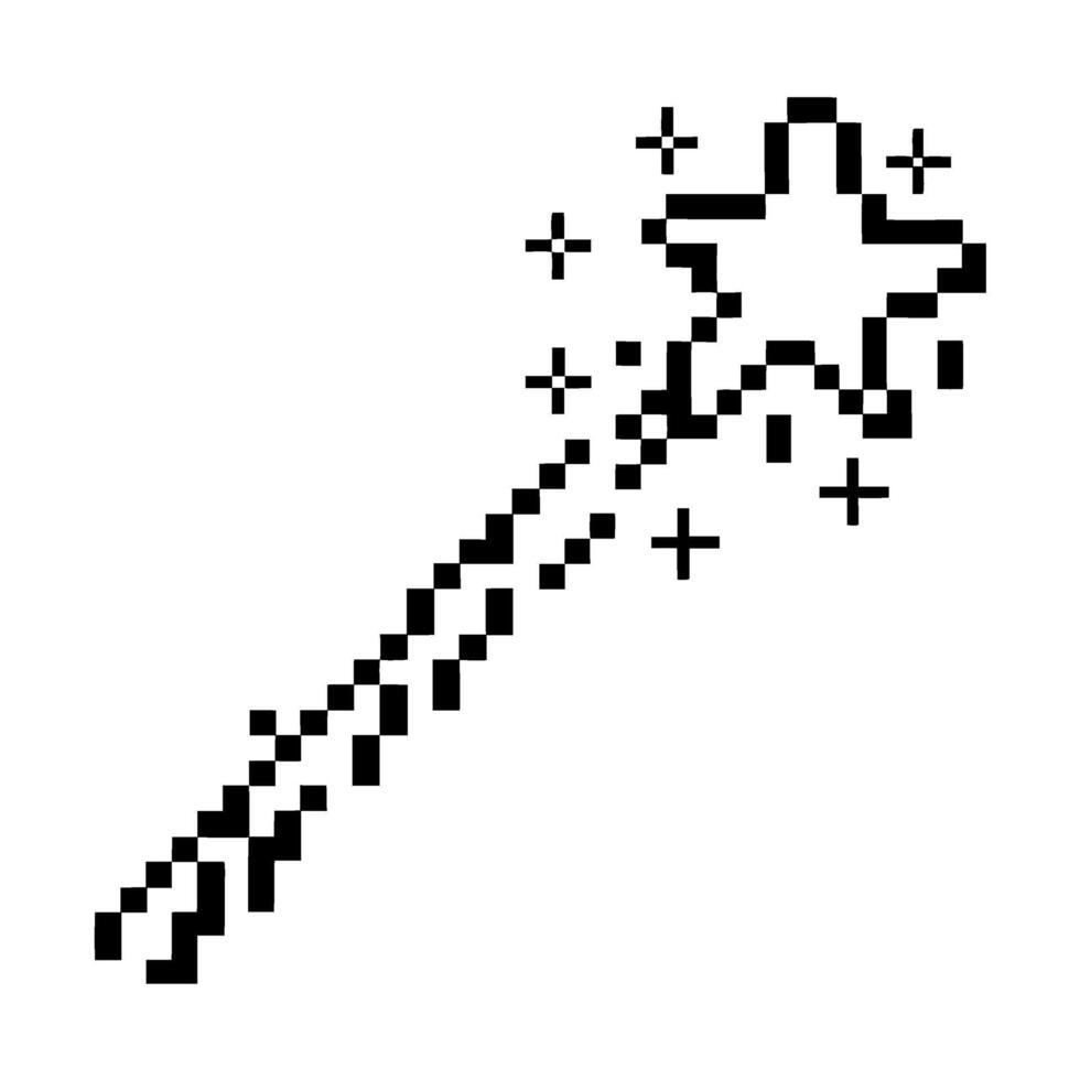 Pixel art magic wand with sparkling star retro digital fantasy element, simple black and white wizard tool, enchanted power Pro Vector