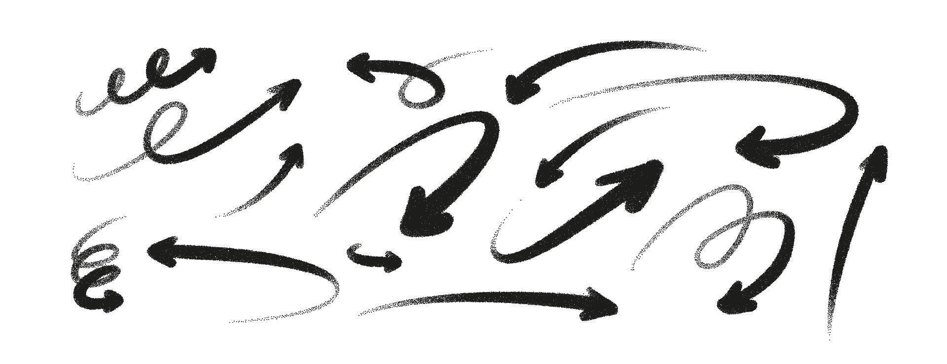 Hand drawn arrow set with rough brush texture and charcoal effect. Abstract sketch arrows in black and white, isolated on background. Grunge pencil doodle lines for design, art, and decoration Pro Vector