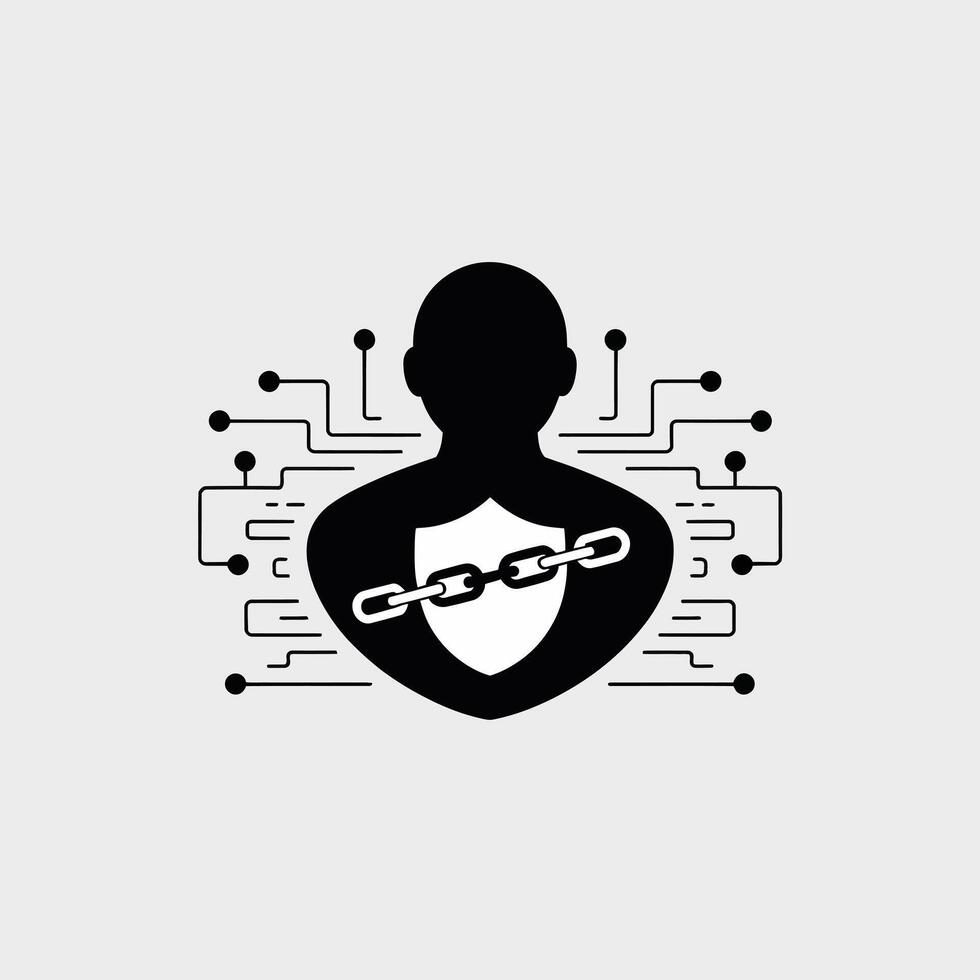 Black Silhouette of a Person with a White Shield and Chain Icon on a Light Gray Background Surrounded by a Circuit Board Pattern Pro Vector