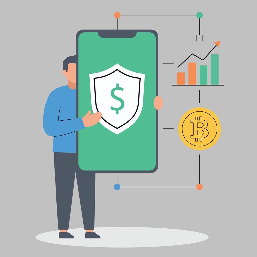 Abstract Character Holding Smartphone with Dollar Shield and Chart Representing Secure Financial Technology and Investment Pro Vector
