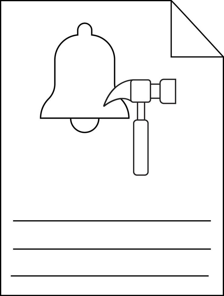 Black and white image shows a bell and a hammer on a document with three lines Pro Vector