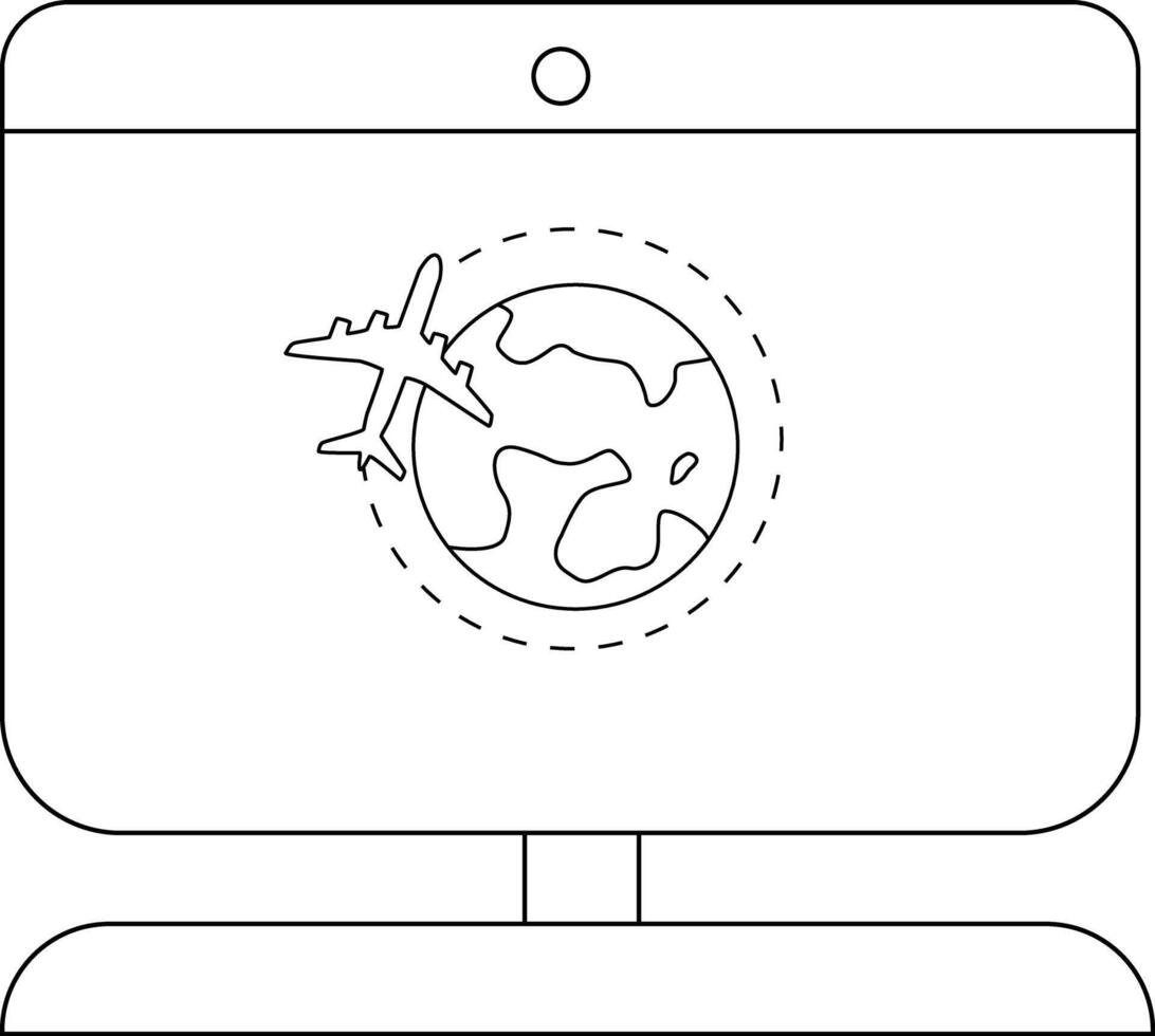 A monitor displaying a globe encircled by a dashed line and an airplane Pro Vector