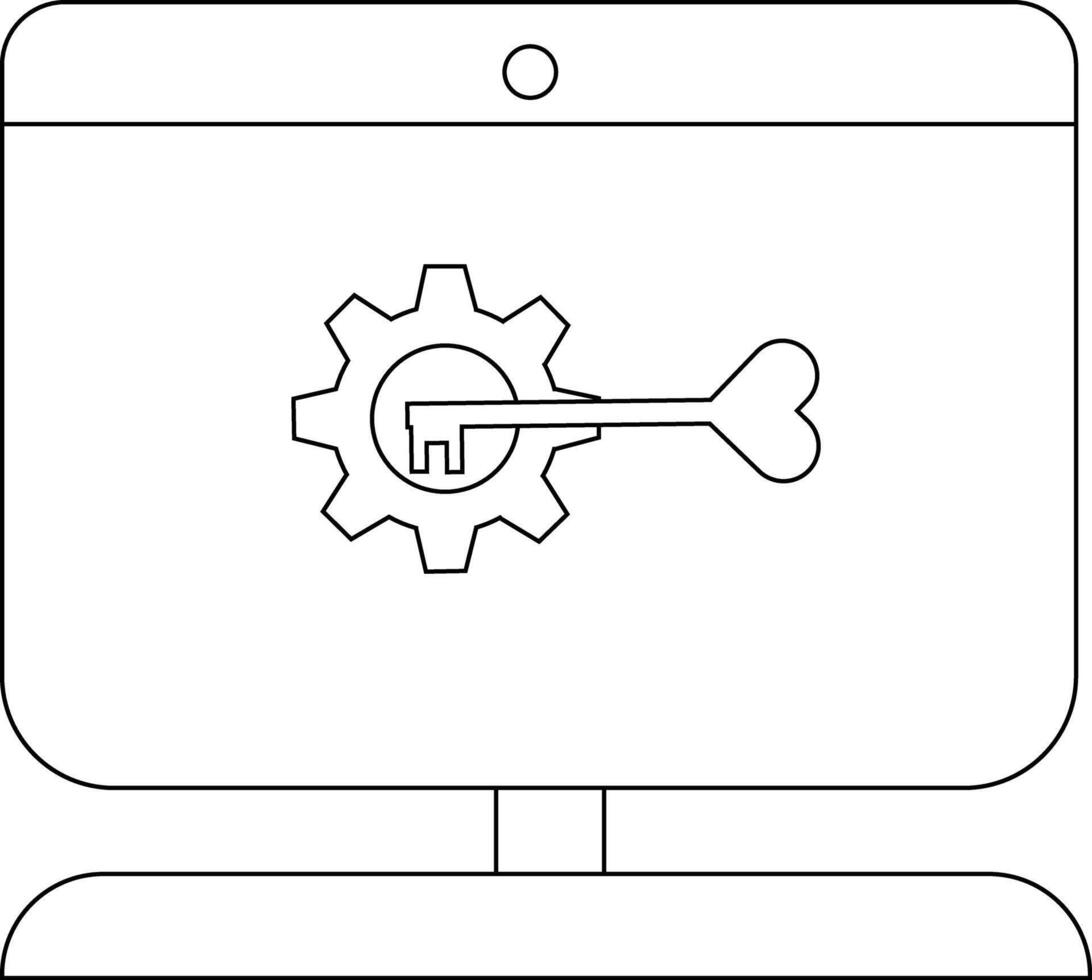 Black and white image of a computer monitor with a gear and heartshaped key symbol on the screen Pro Vector