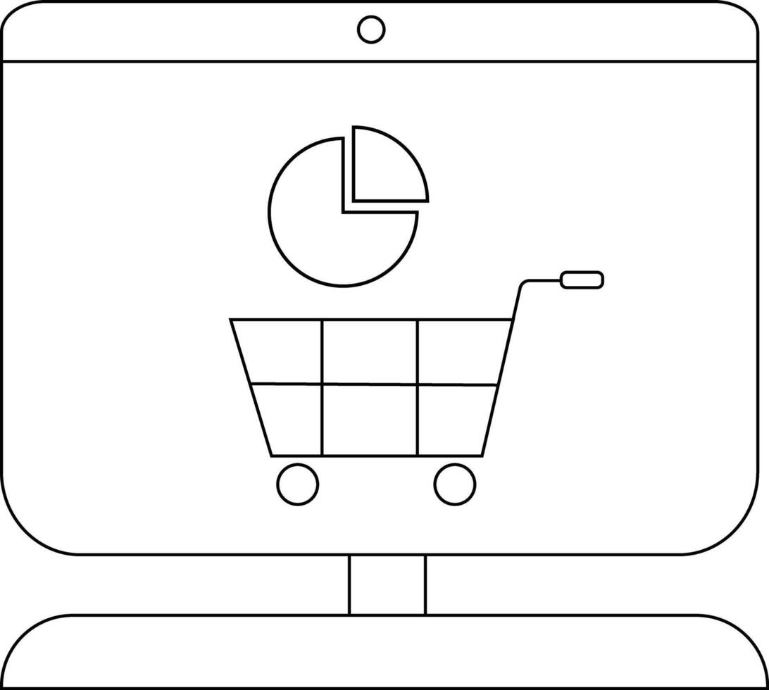 Outlined monitor shows a shopping cart below a pie chart resting on a rectangular base Pro Vector