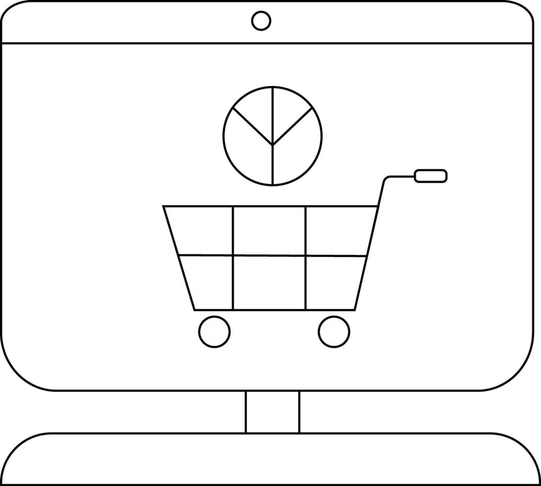 Line art of a computer screen displaying a shopping cart with a pie chart above and two circles at the bottom Pro Vector