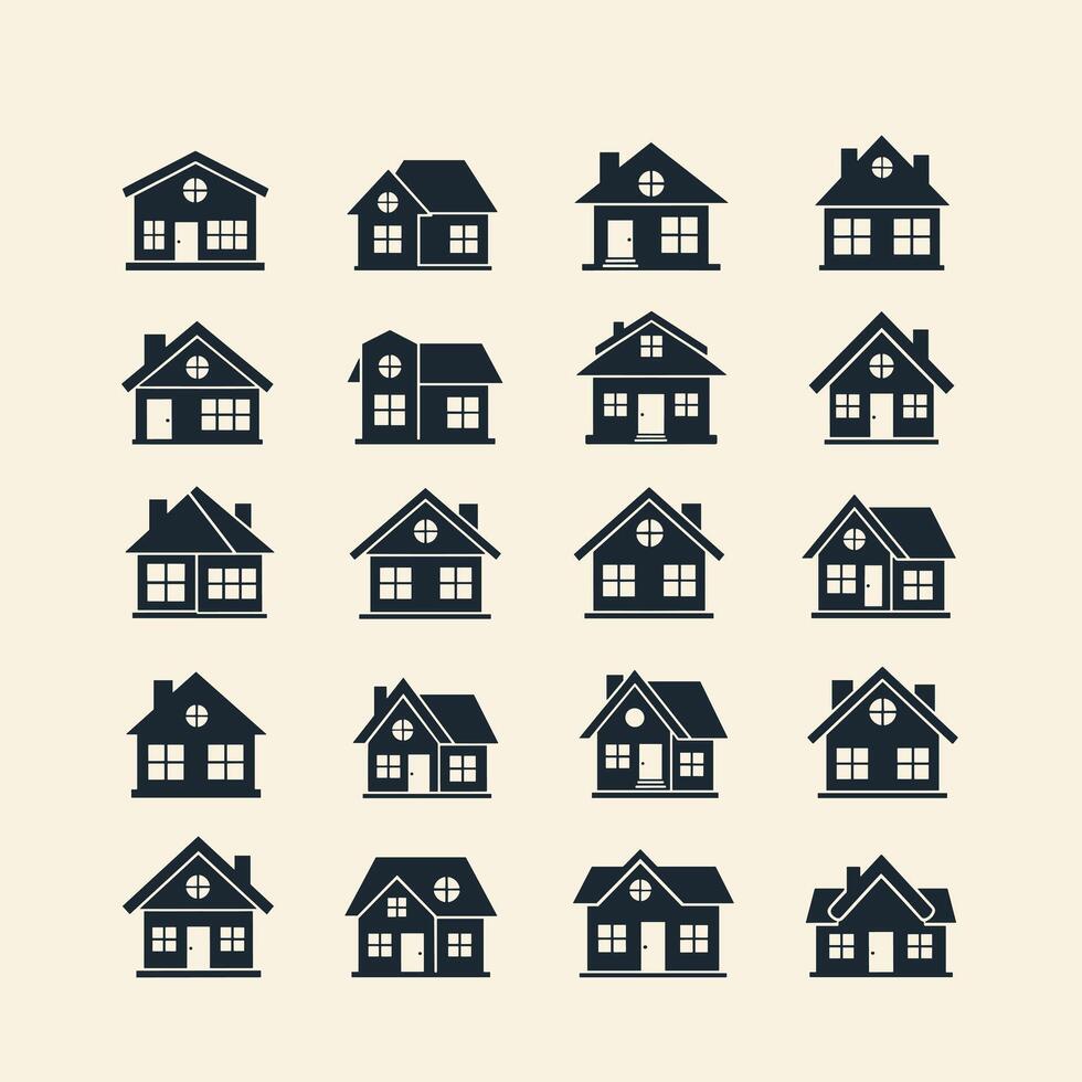 A collection of simple pixel art house icons representing different architectural styles and designs. Pro Vector