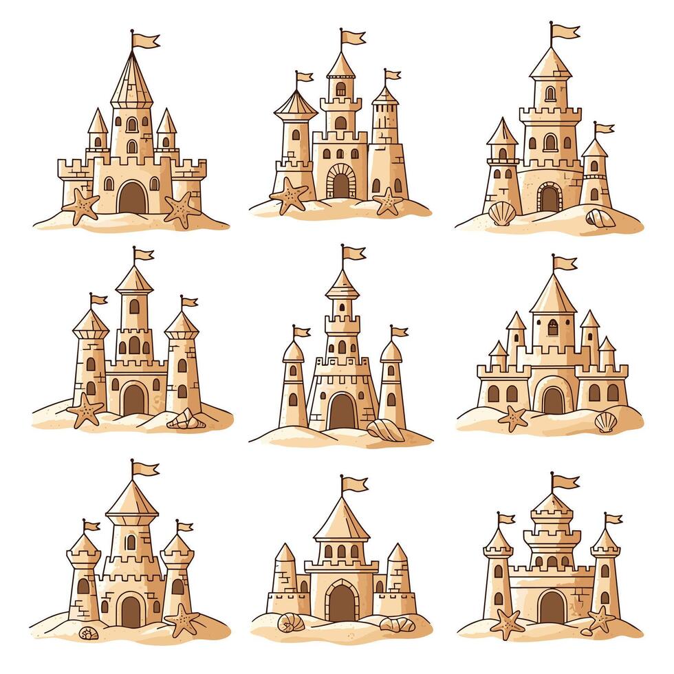 Collection of intricately designed sand castles each featuring unique architectural elements and adorned with flags. Pro Vector