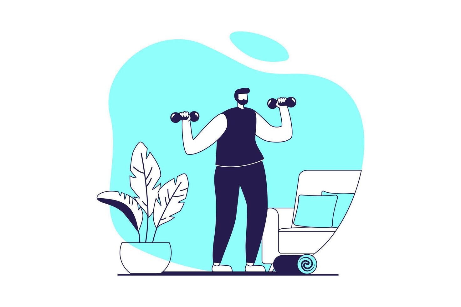 Fitness at gym web concept with flat people for website design. Man training with dumbbells at home, doing exercises with strength program, bodybuilding and pumping muscles. illustration. Pro Vector