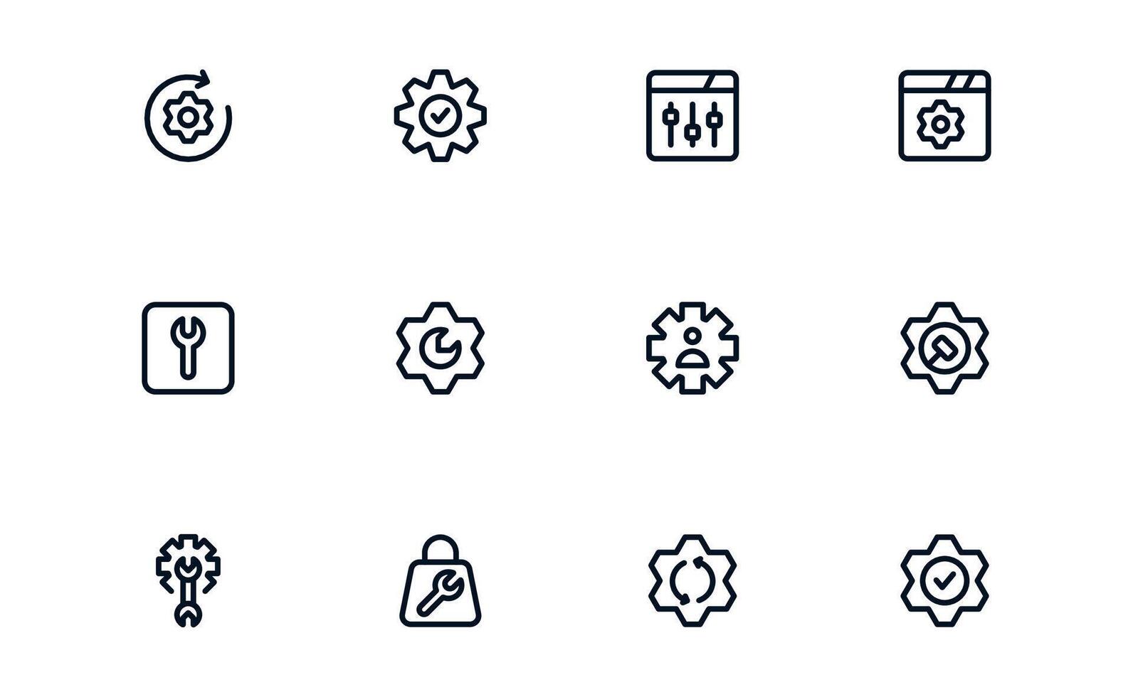 Sleek Settings and Maintenance Icon Pack displaying Maintenance Platforms, System Dashboards, and Configuration Tools Pro Vector