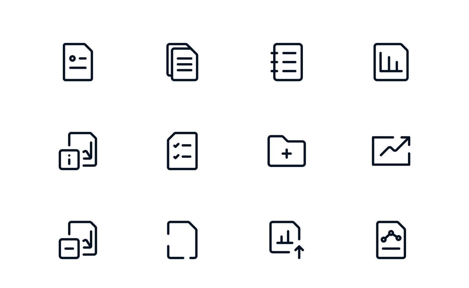 Modern Document Processing and Workflow Management Icon Collection presenting Office Productivity, Document Apps, and Task Management Tools Pro Vector