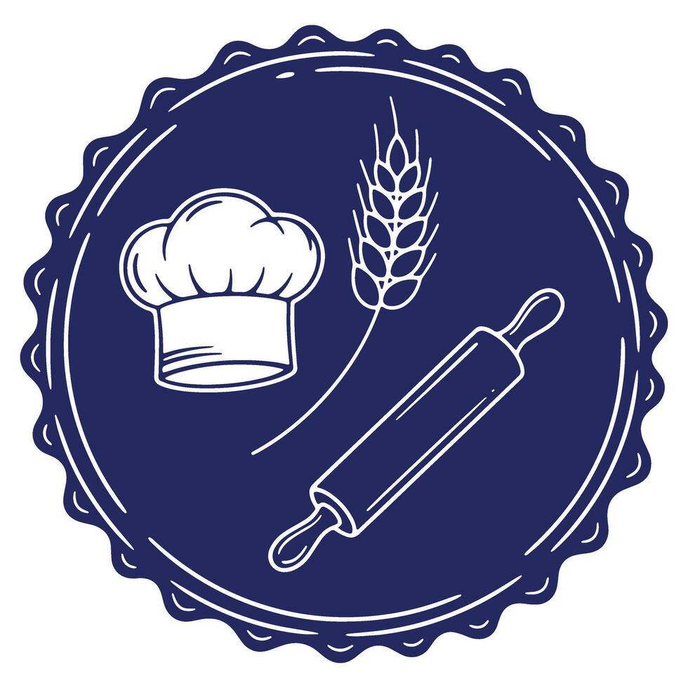 Culinary Design Featuring a Chefs Hat Wheat Stalk and Rolling Pin Inside Scalloped Circle Badge for Baking and Food Related Projects Pro Vector