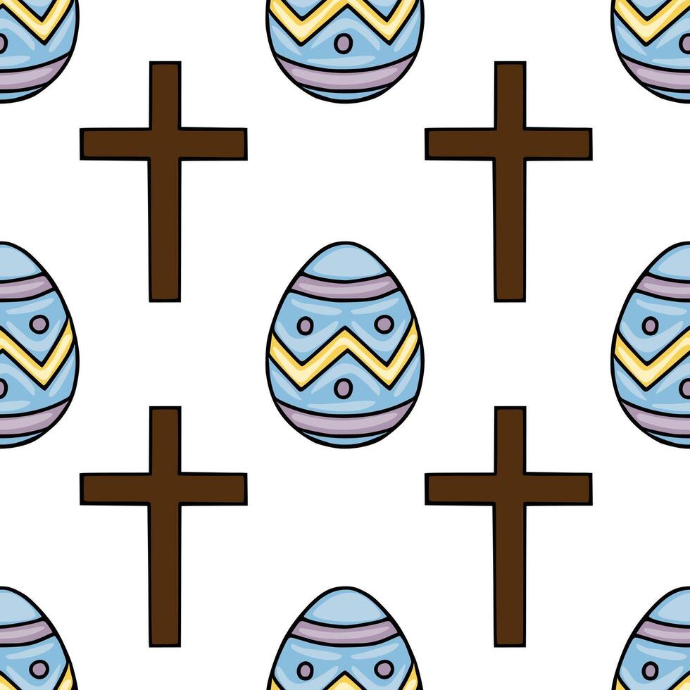 Seamless pattern of stylized Easter eggs and brown Christian crosses on a white background, featuring a playful, graphic style. Pro Vector